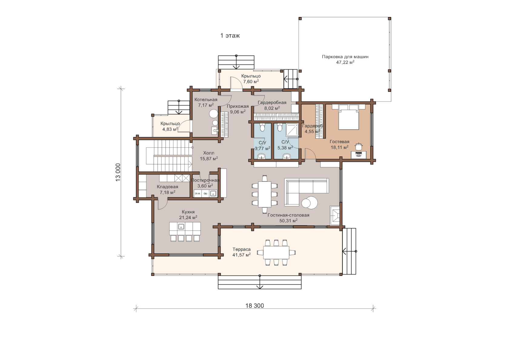 — кухня — гостиная-столовая с выходом на террасу — гостевая спальня ч личным санузлом и гардеробом — санузел — технические помещения: постирочная, котельная, кладовая, гардеробная