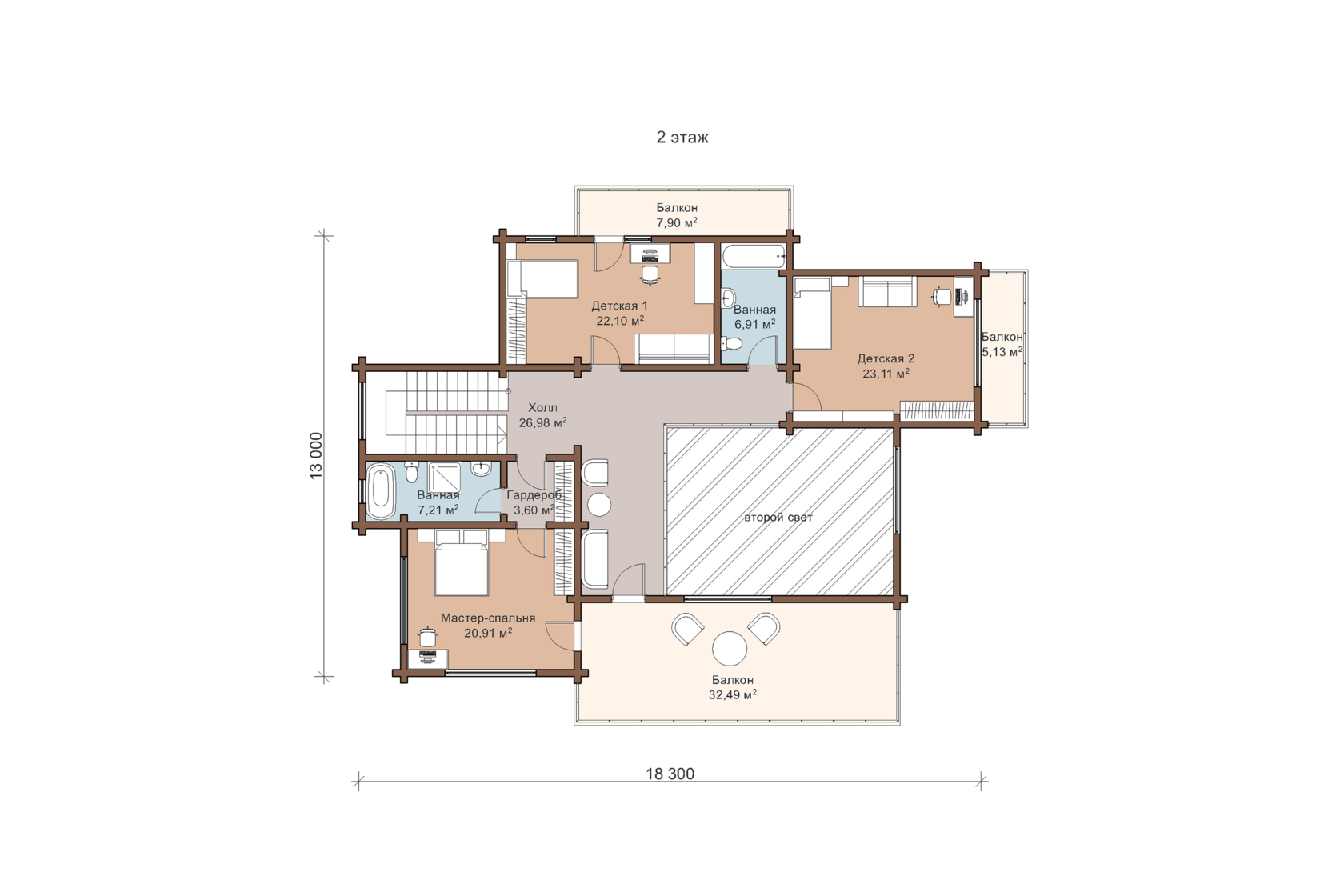 — холл — две детские комнаты с выходами на балконы — мастер-спальня с индивидуальным санузлом и гардеробной — просторный балкон — второй свет