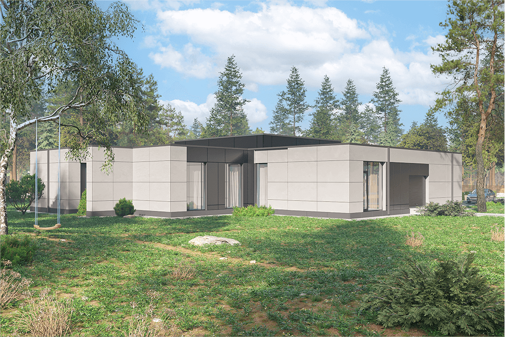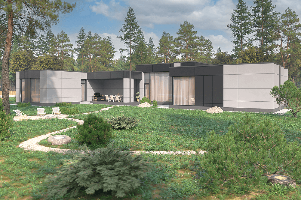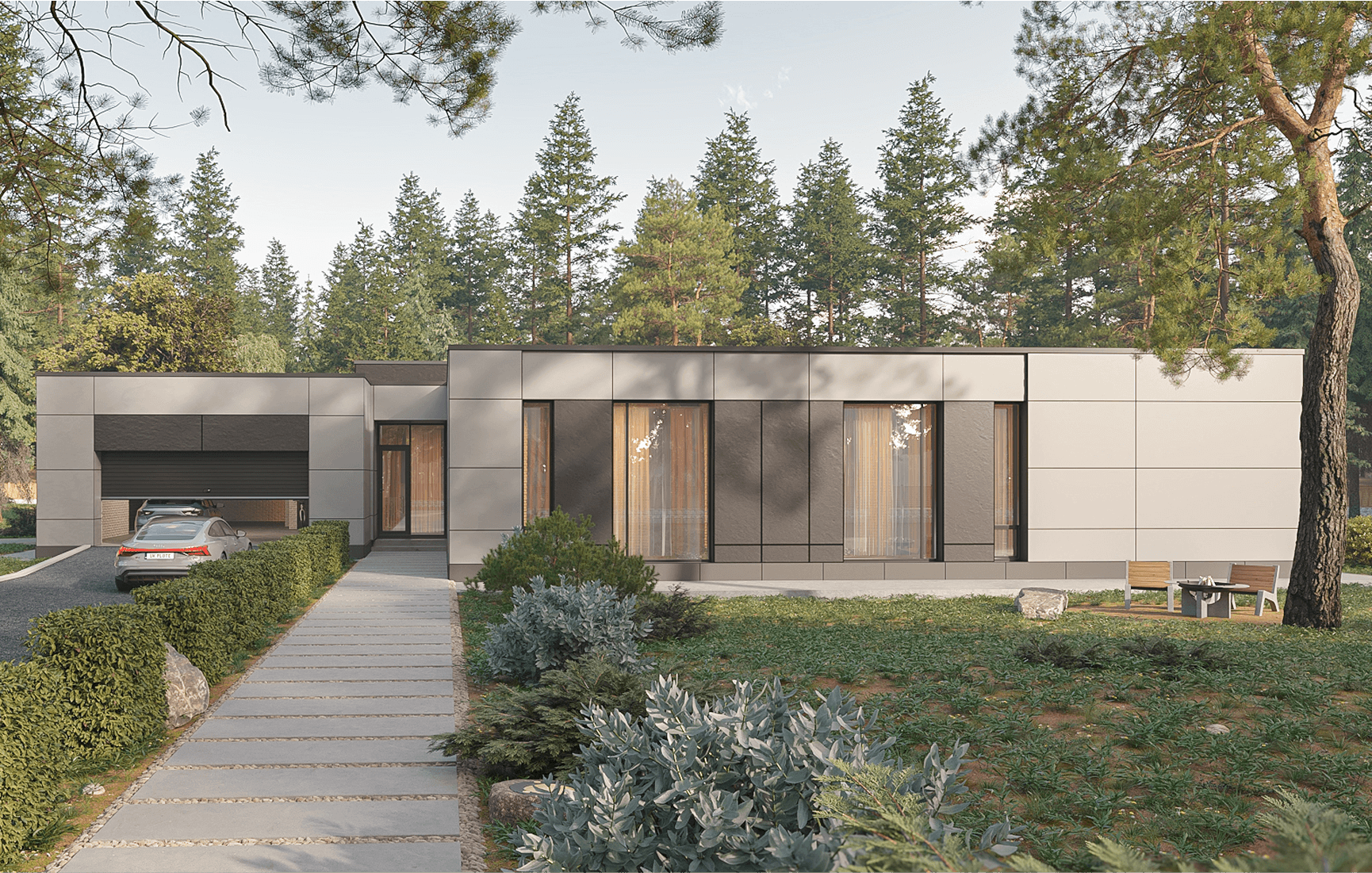 Проект «Хромет» представляет собой стильный одноэтажный дом с простыми формами, подходящий для комфортного загородного проживания. Архитектура выполнена в духе минимализма, где каждая деталь отражает идеи удобства, умиротворения и функциональности. Контраст между светлыми стенами и темными акцентами создает яркий визуальный эффект и подтверждает современность дизайна.