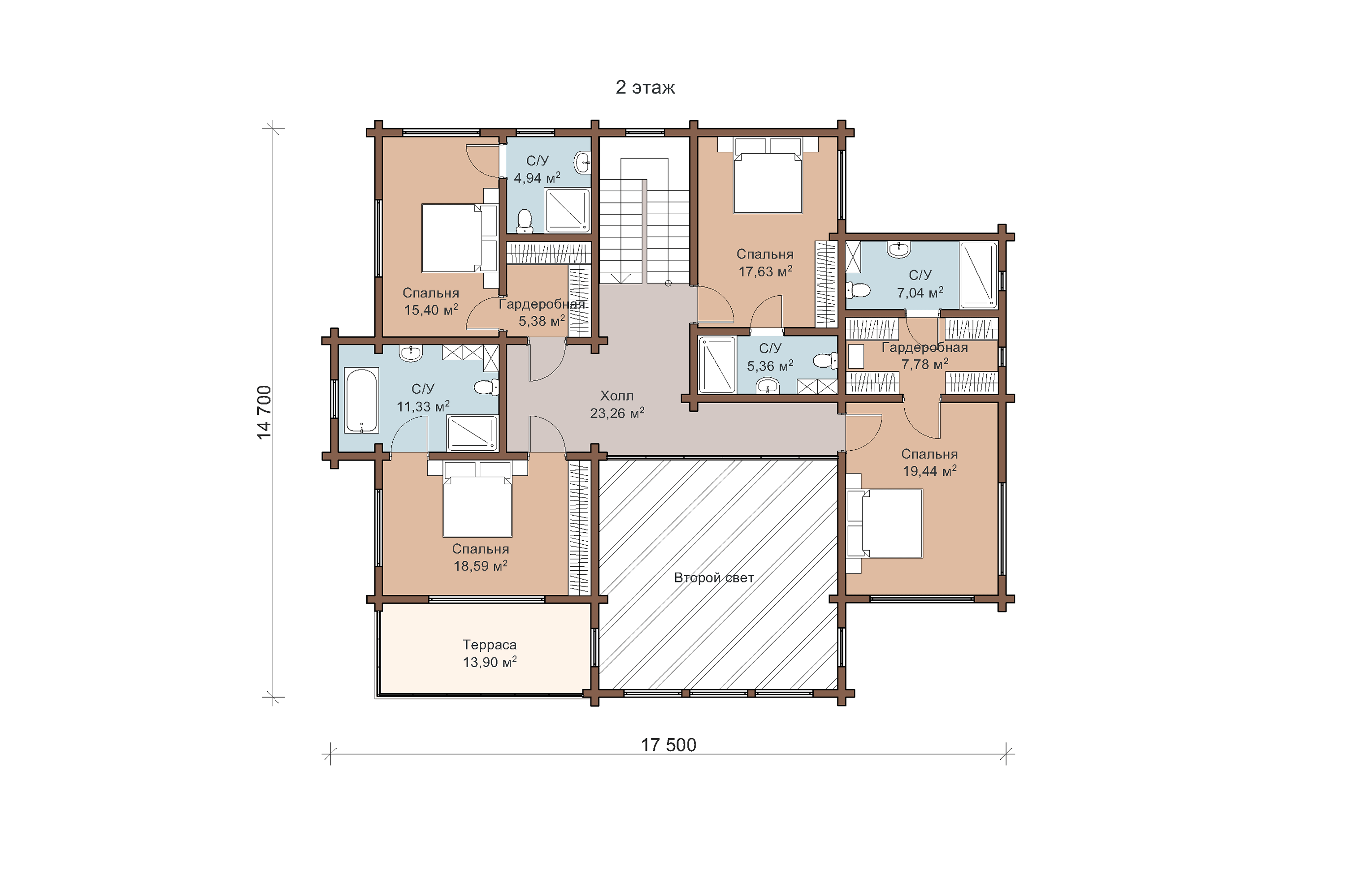 — холл — две мастер-спальни с личными санузлами и гардеробными комнатами — две спальни с личными санузлами — терасса — второй свет