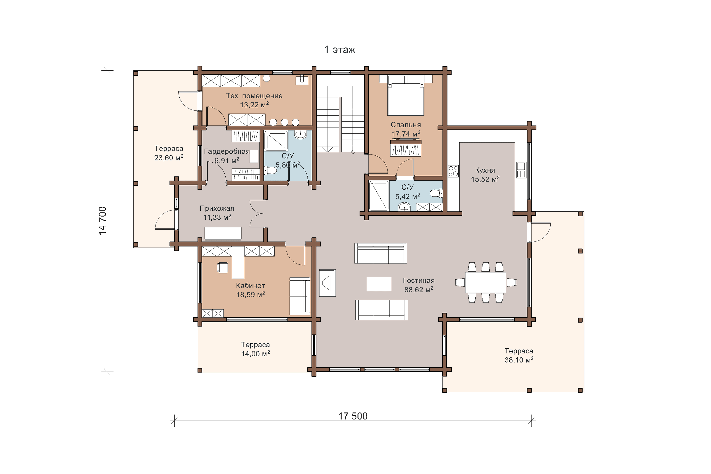 — П-образная большая кухня — гостиная, совмещенная с обеденной зоной — спальня с личным санузлом — гостевой санузел — рабочий кабинет — гардероб и техническое помещение — три открытые террасы